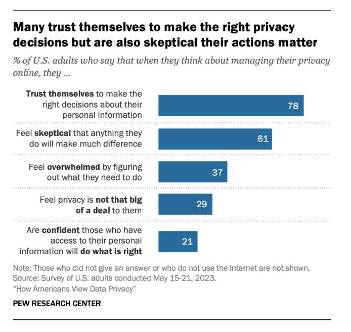 But here’s what the same study also reveals that makes me hopeful: 78% of Americans trust themselves to make the right decisions about their data, if given the opportunity.[1] People don’t need to be told what to do with their data. Like I described in a previous article, what’s acceptable to share is subjective and comes with nuance. Companies with conflicting interests to their users are not reliable to decide such things on their users’ behalf. What people need is straightforward: the infrastructure to communicate their own preferences to the marketplace and representation to enforce those preferences once they’ve made them.