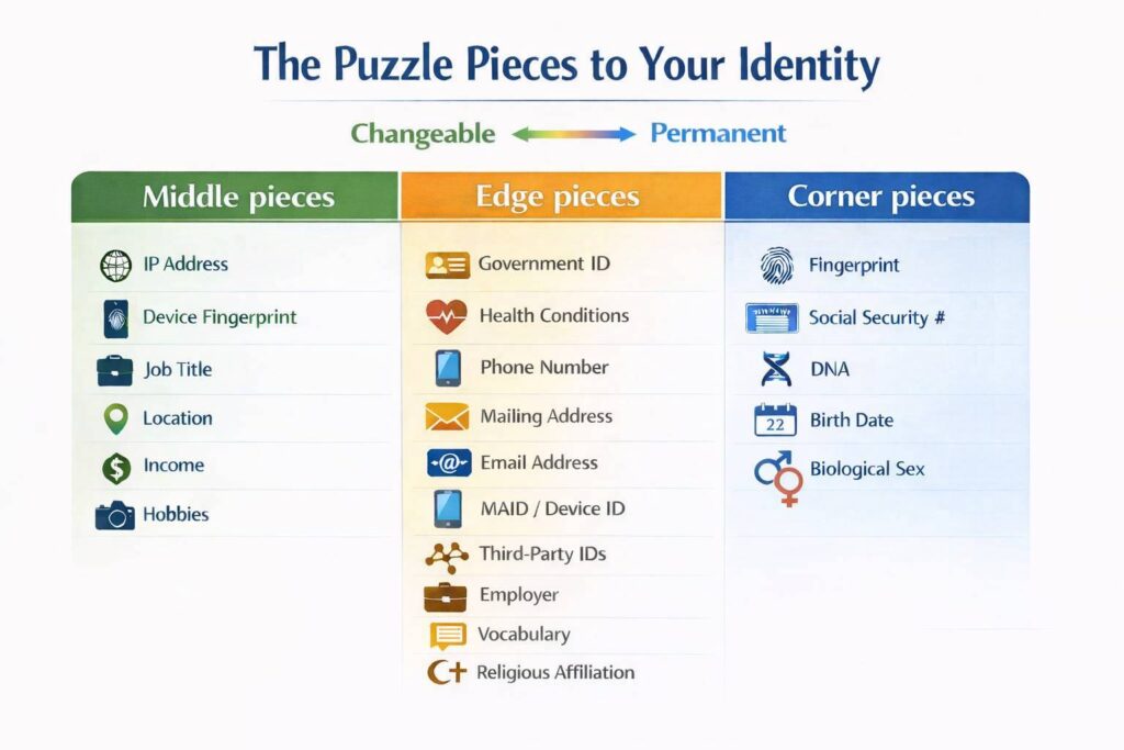 The corner pieces to your puzzle are your permanent attributes, such as your fingerprints, DNA, birth date, and biological sex. These markers stick with you forever and have always been understood as part of your identity. Just like the corner pieces pop out to us when we search through a sea of puzzle pieces, data aggregators scour for your permanent data so data brokers know which pieces belong to your identity puzzle. Finding one of these pieces is a very valuable reference point.